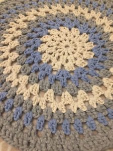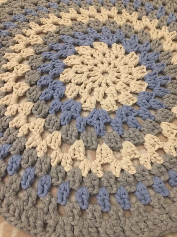 Този килим е изработен с пухкава шарка. Килимите, изработени по този модел, ще бъдат украшение за детската стая и са меки и приятни на допир. От основата на въздушните бримки съберете малък брой бримки, след което ги завържете заедно, за да образуват буца, която се приема за единична бримка. Започвайки от следващия ред, плетете зигзагообразно.
