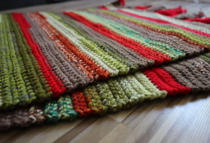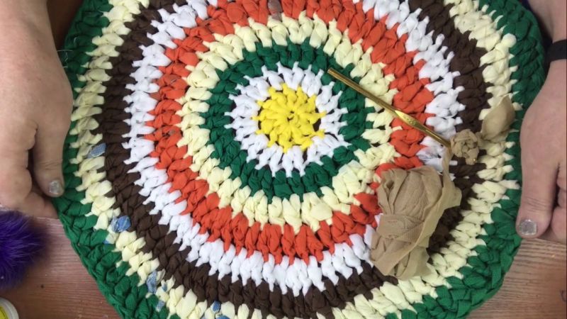 Възелите ще бъдат твърде обемни и ще развалят визията. Това е материалът за кръгли изтривалки и дълги многоцветни покривала, покривала за столове в рустикален стил. Многоцветните остатъци и фантастичните пухкави прежди са подходящи за многоцветни и различни по форма килими.