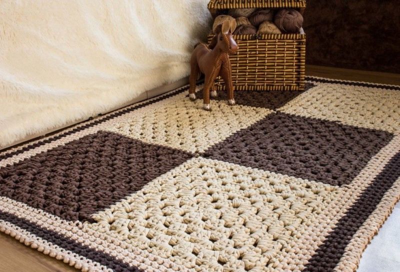 Използването на един-единствен плътен десен с минимум детайли също може да изглежда елегантно. Не се нуждаете от сложни модели и красиви, скъпи прежди. Обикновените килими могат да се плетат с шев с или без шев.
