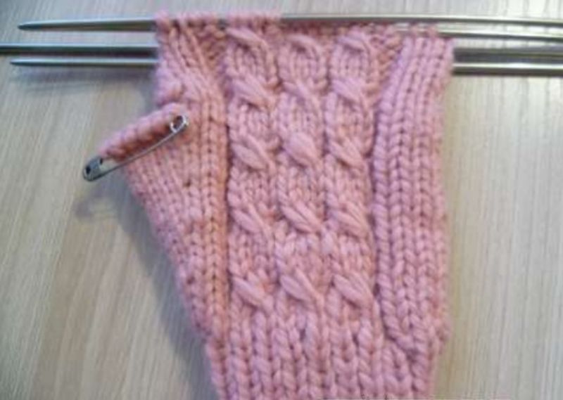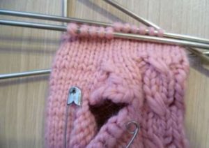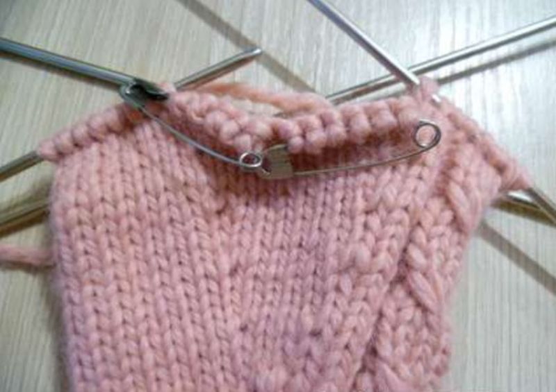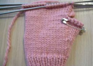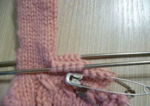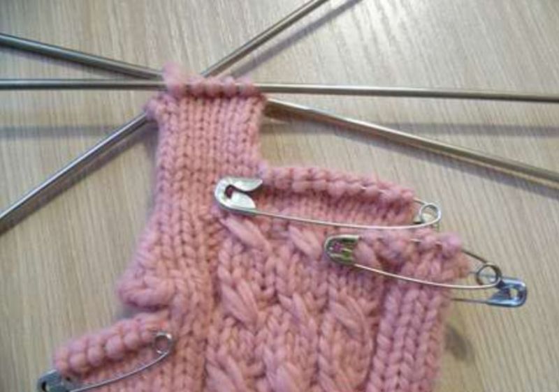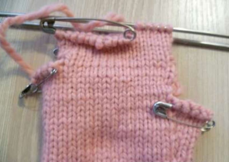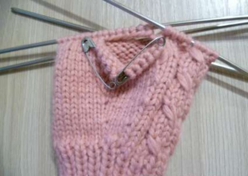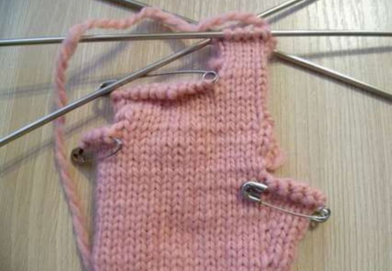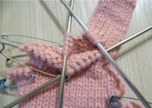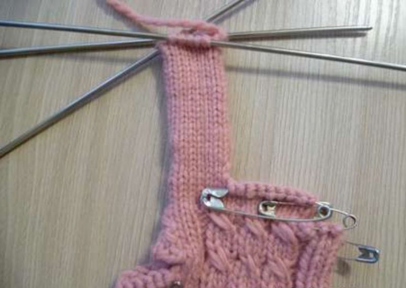 - При достигане на височината на палеца всички елементи на клина се отстраняват върху 2 щифта. Над тях примките се достигат отново и плетенето продължава.