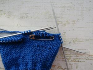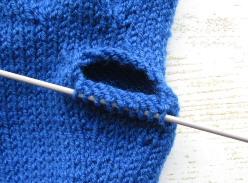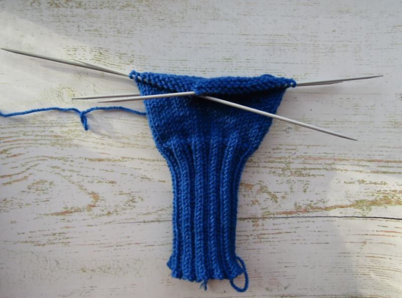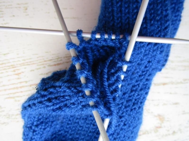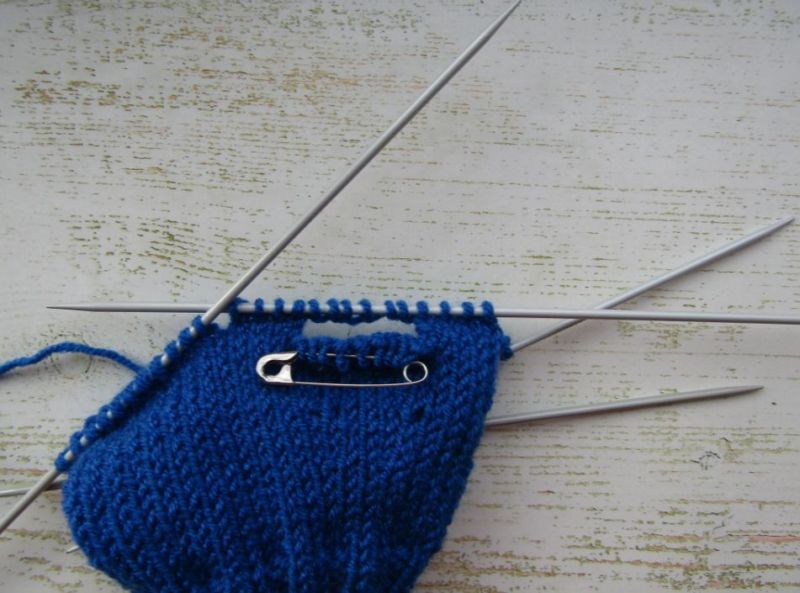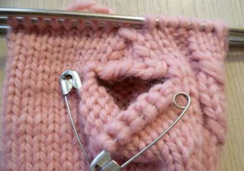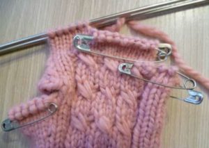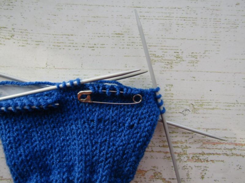 - При достигане на височината на палеца всички елементи на клина се отстраняват върху 2 щифта. Над тях примките се достигат отново и плетенето продължава.