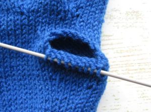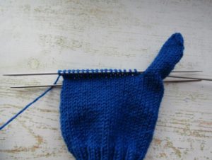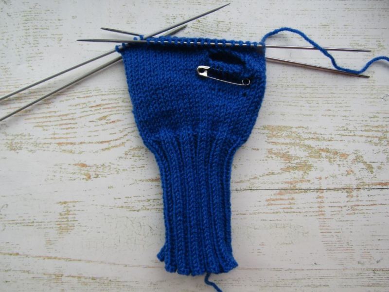 - Когато отворът за палеца е готов, продължете да плетете в кръгова схема, докато парчето придобие правилния размер.