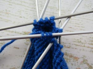 - Останалите четири бримки се плетат по същия начин, но цветът се сменя на всяка бримка;
