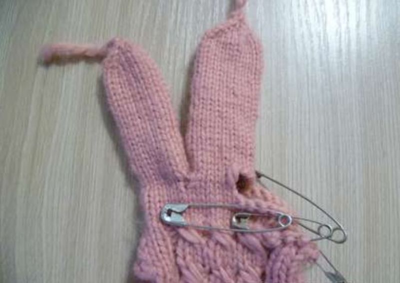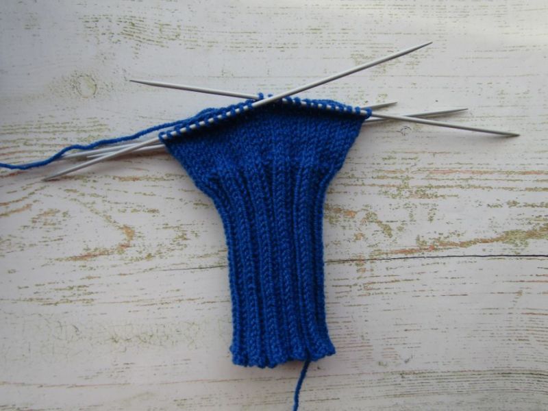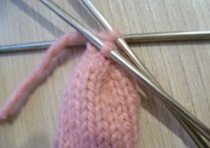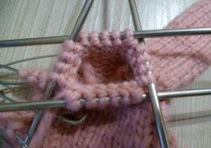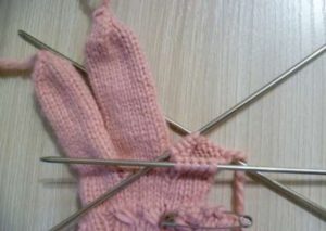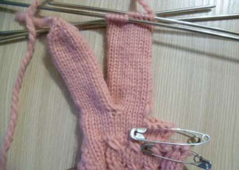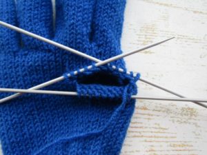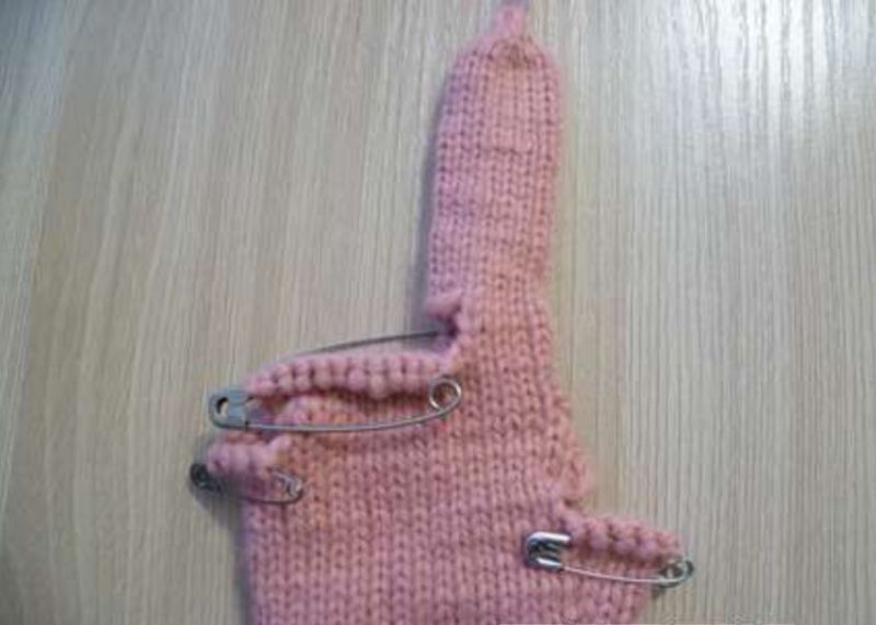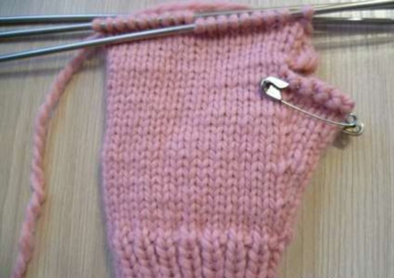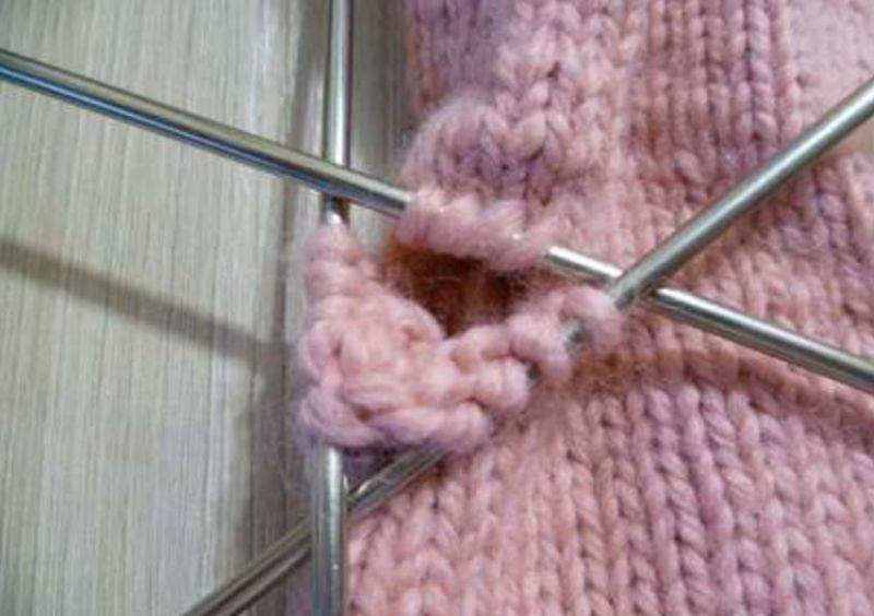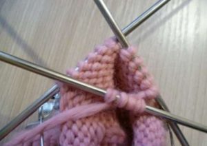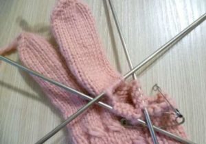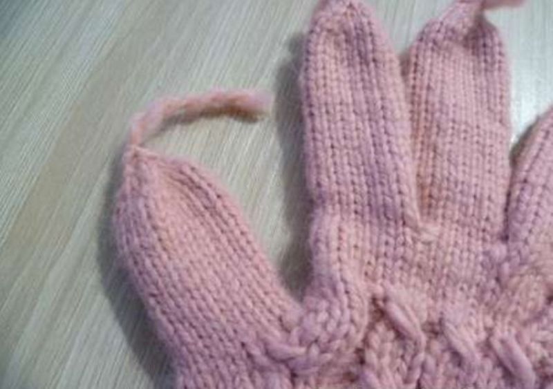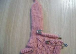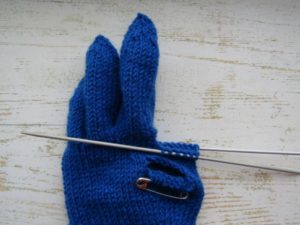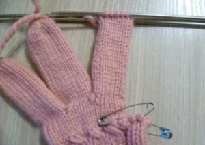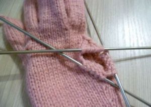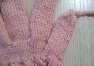 - За да се получи малкият пръст, последните бримки от дланта и първите бримки от задната страна се вземат на отделна игла (за точния брой вижте описанието на избрания модел). Между тях се зашива мост от два шева. Общият брой бримки се разпределя между останалите 3 инструмента и се плете в кръг, за да се получи необходимата височина. Останалите П се плетат с 10 мм по-високо и още две бримки се вземат от премката, разположена на малкия пръст.