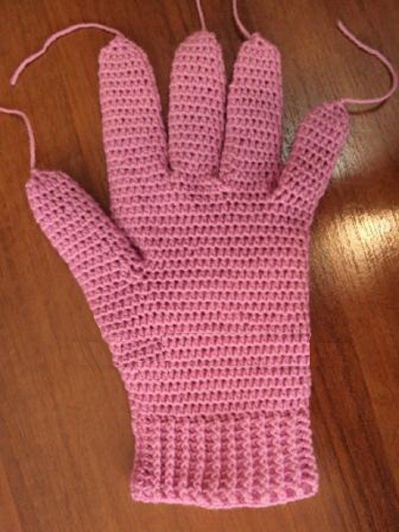 - за палеца се изваждат 5 П на игла, след това се пришиват 5 ГП и се плете зона, чиято височина е равна на разстоянието от палеца до края на дланта;