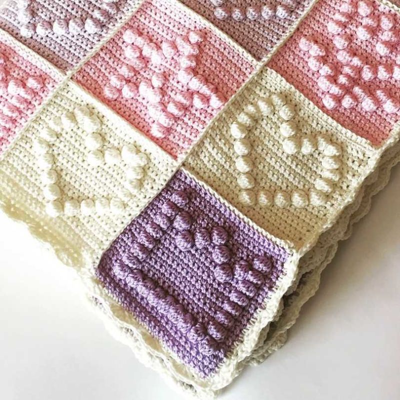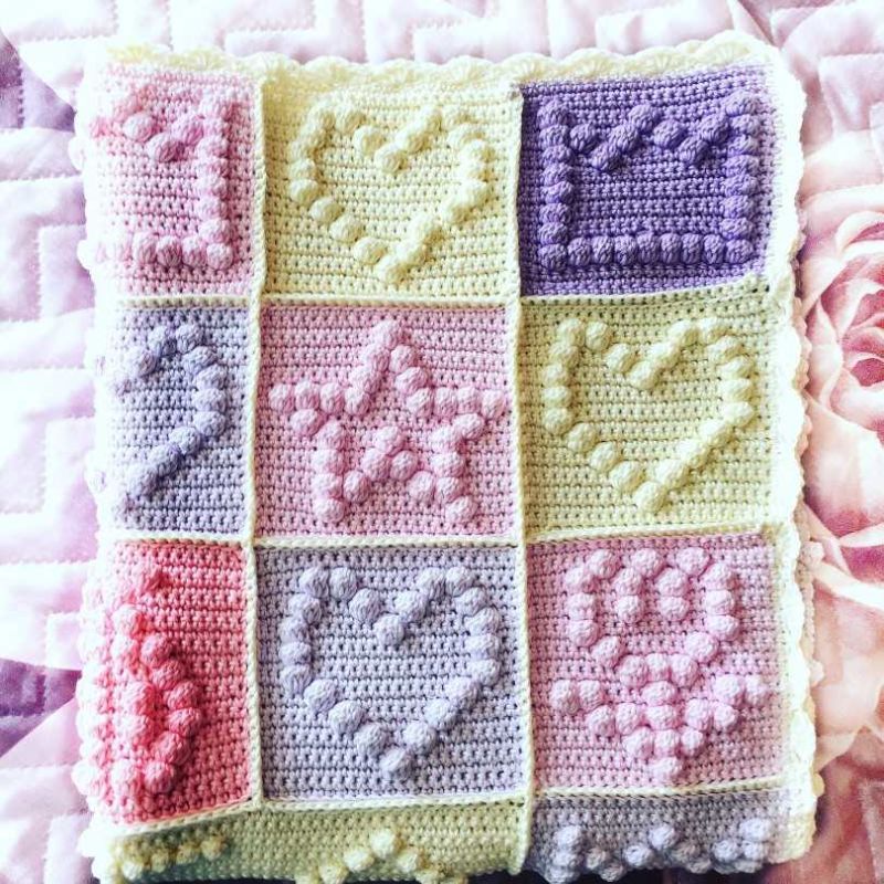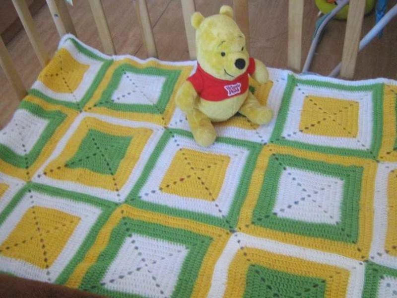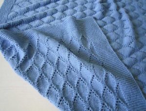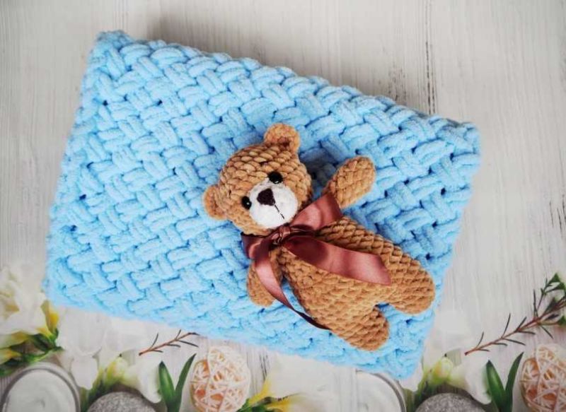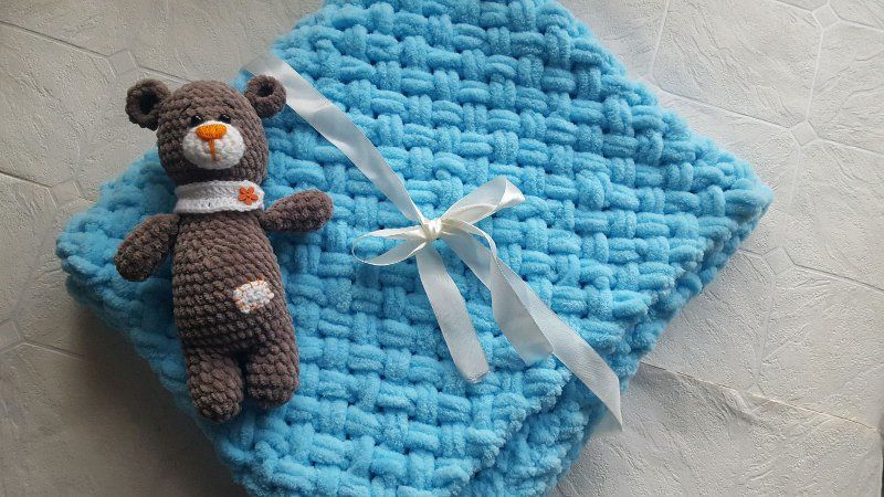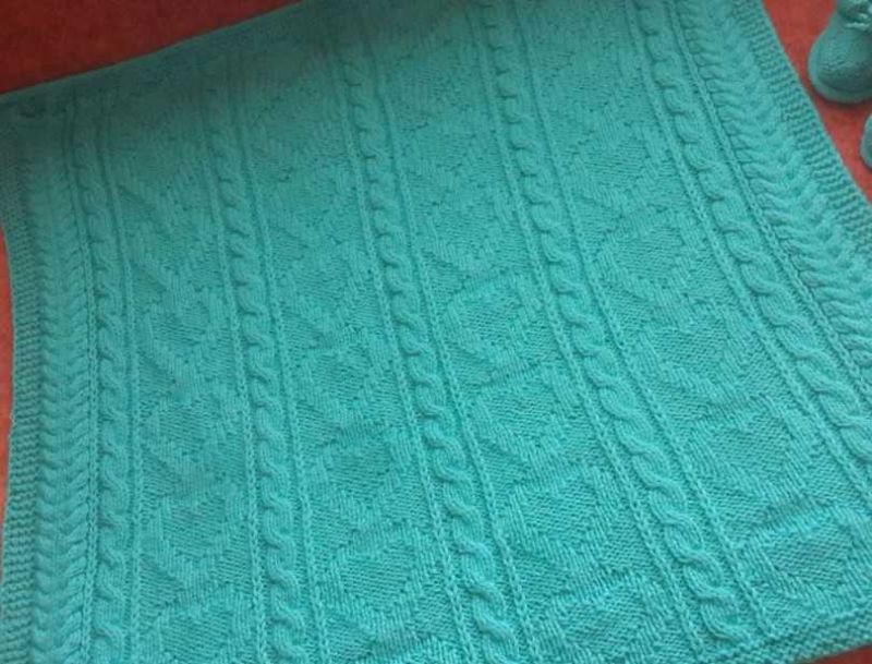 Желателно е готовата проба да се подложи на влажна топлинна обработка, за да се види как се държи тъканта след пране. Бебешкото одеяло може да бъде с размери 80x100 cm за новородено и 150x200 cm за възрастен. Разходът на прежда може да достигне до три килограма.