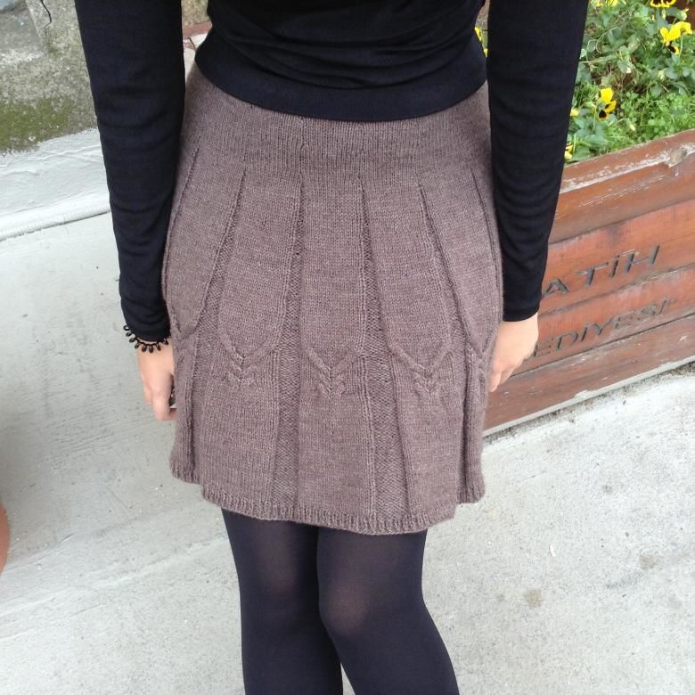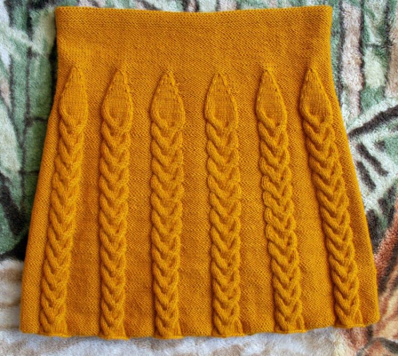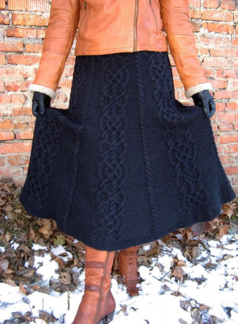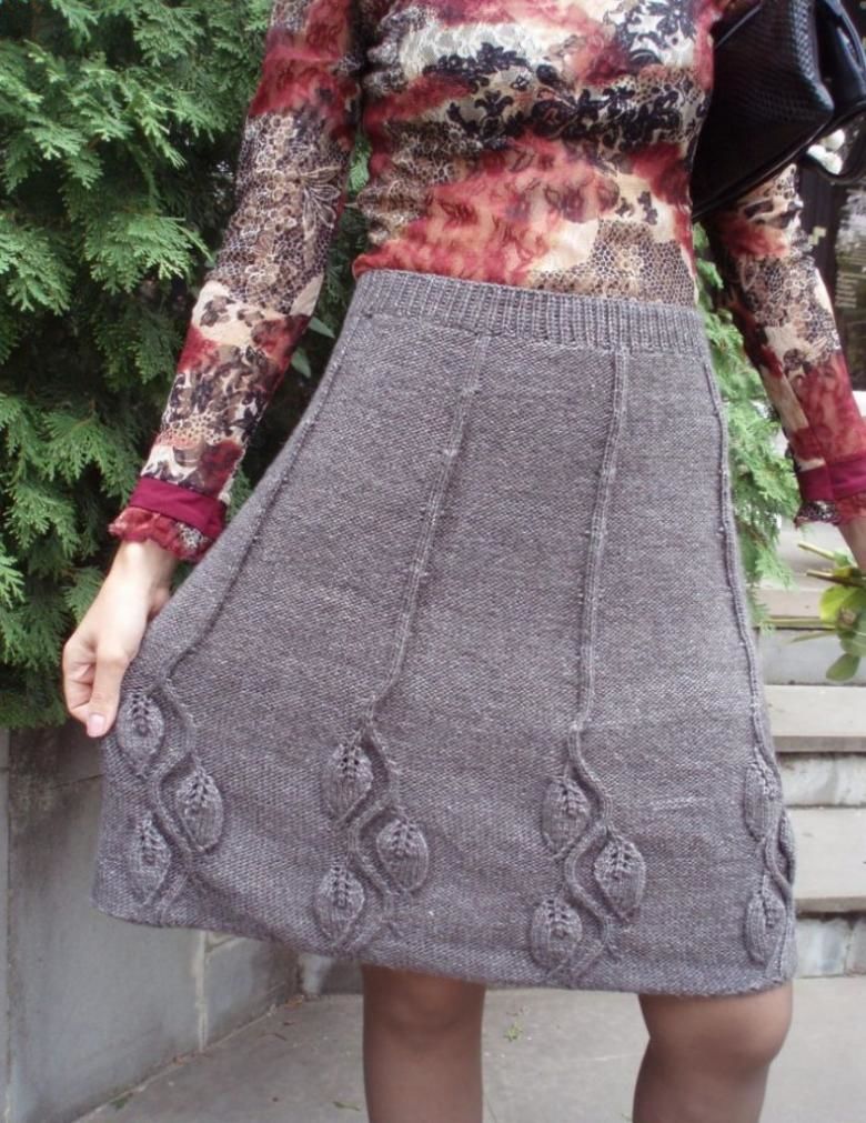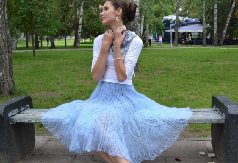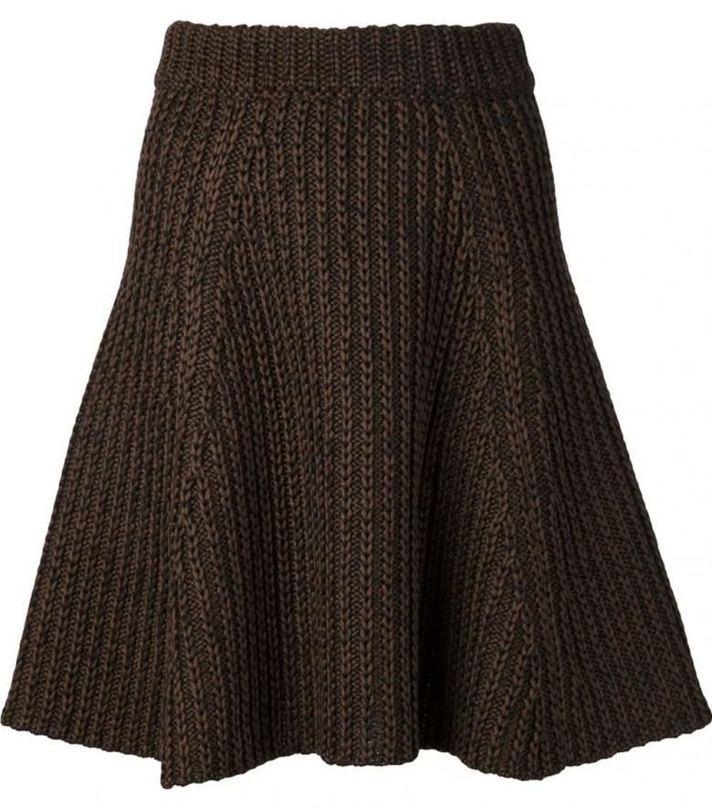 Деми-пола за студения сезон. А-образният силует, разширен в долната част, е изплетен от плътна вълна. Когато избирате, обърнете внимание на пухкавостта. Знайте, че когато от нишките се отделят много малки влакна, ушитата пола ще бъде по-пълна.