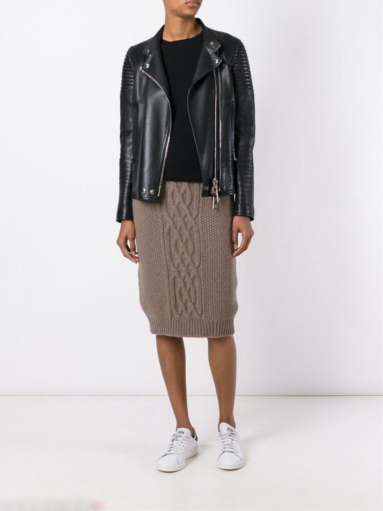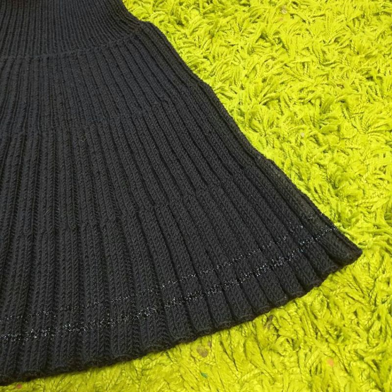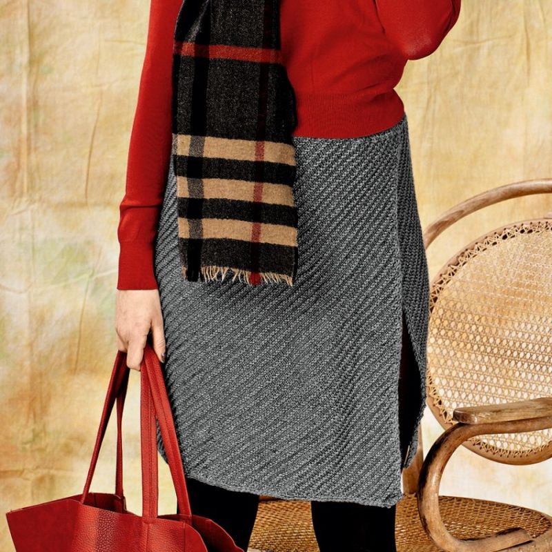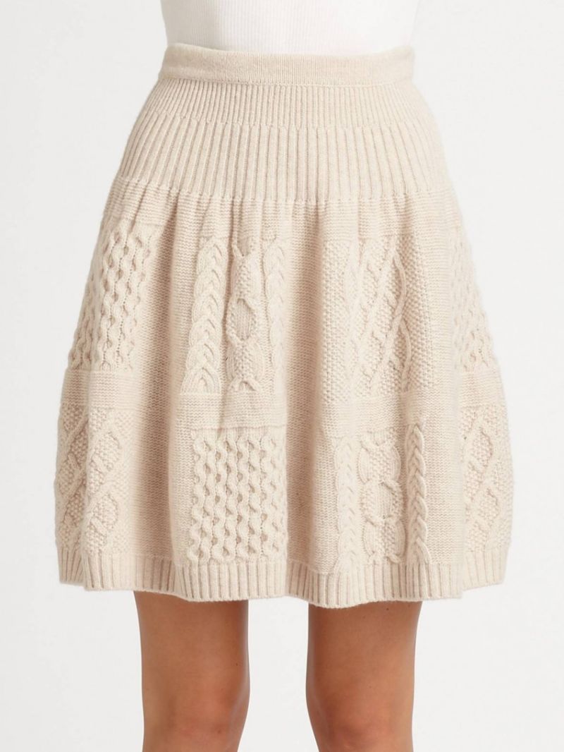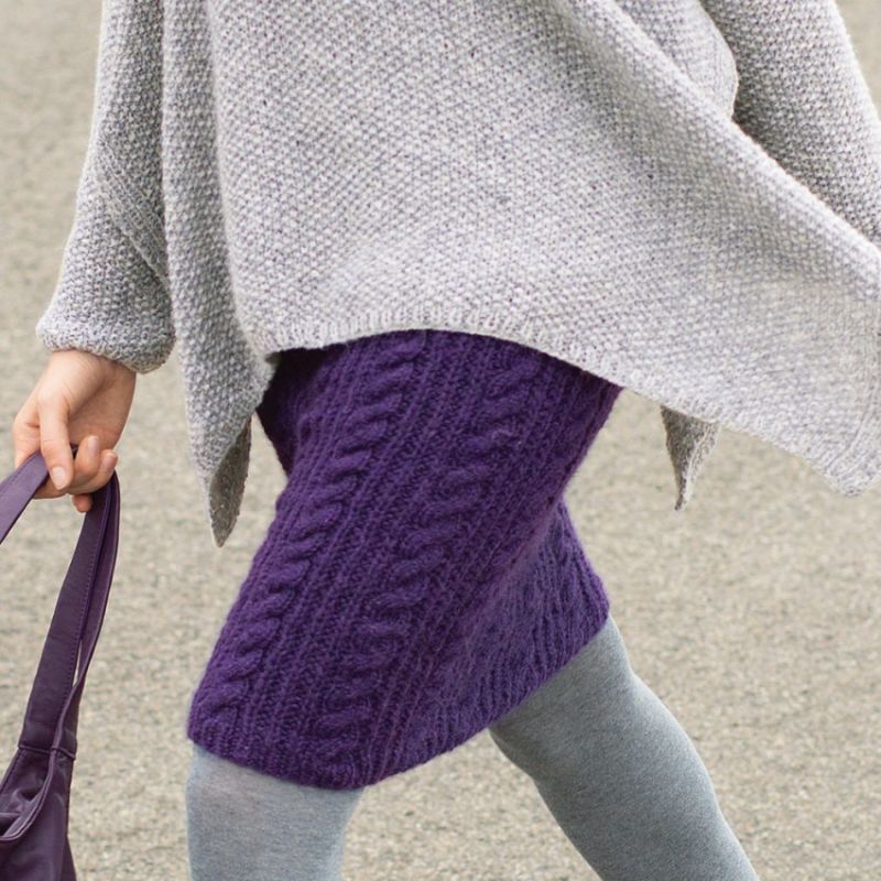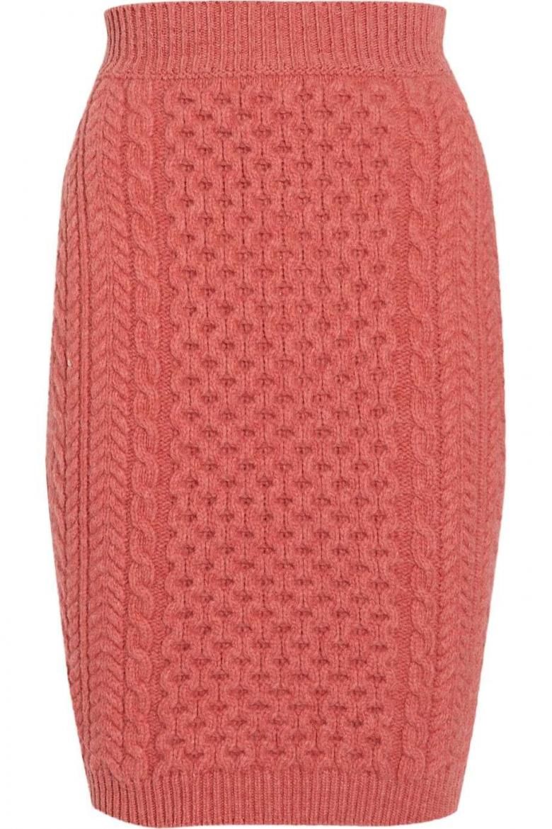 Деми-пола за студения сезон. А-образният силует, разширен в долната част, е изплетен от плътна вълна. Когато избирате, обърнете внимание на пухкавостта. Знайте, че когато от нишките се отделят много малки влакна, ушитата пола ще бъде по-пълна.