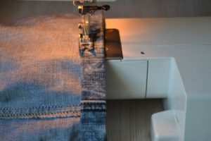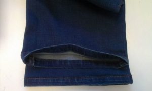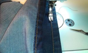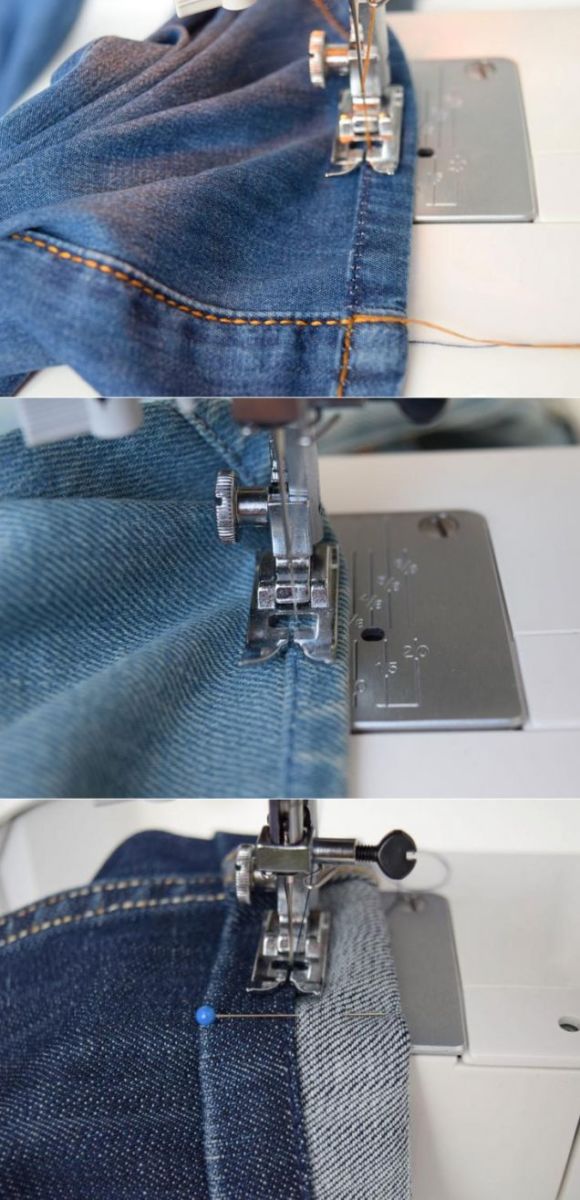 За този метод ще ви е необходима самозалепваща се лента. Залепете (съединете) вътрешната страна на подгъва и основния панталон отпред и отзад в центъра на две места. Обърнете дънките навън и зашийте право нагоре и надолу само по страничните шевове.