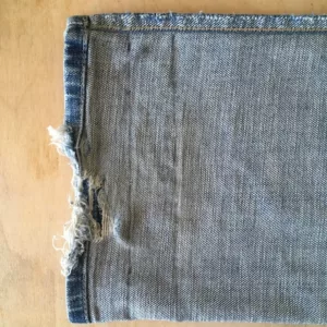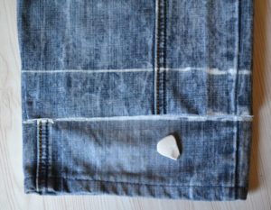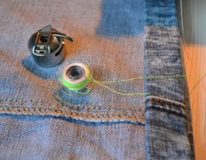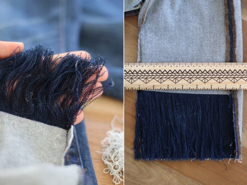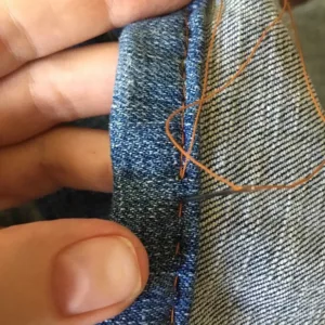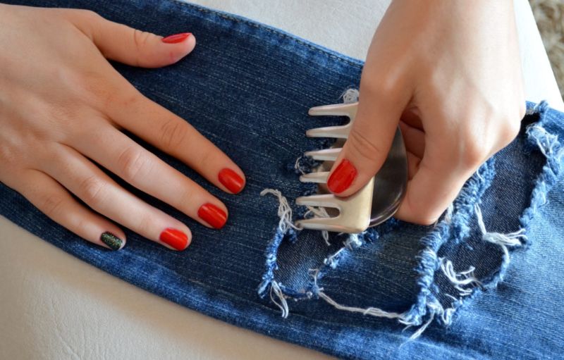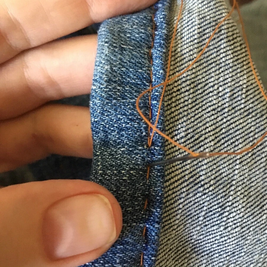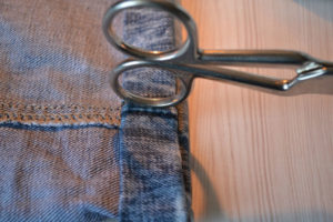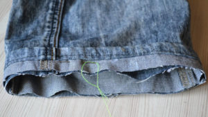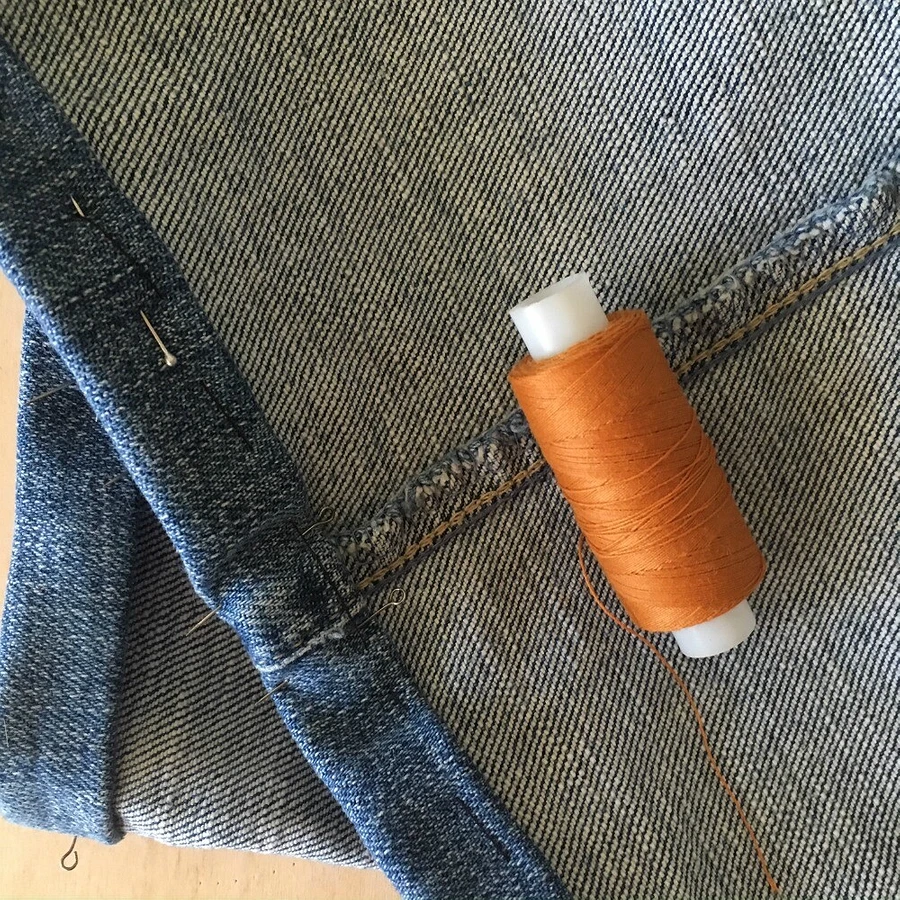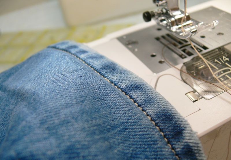 Обърнете дънките наобратно и ги зашийте със същия цвят конец. Тъканта е груба по шевовете, затова потупайте шевовете с чукче или с пръстените на ножица.
