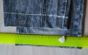- Първо, изчислете окончателната дължина на дънките си и очертайте линия с тебешир или парче сапун. Добавете 1,5 см за надбавка за шев и я отбележете на пунктираната линия.