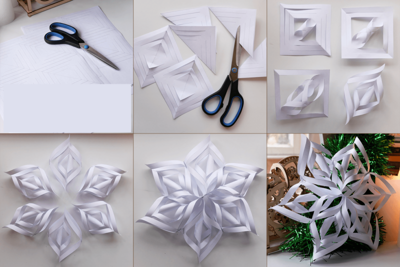 За да изрежете красива снежинка от хартия, използвайте схемите, които можете да намерите в интернет. Можете също така да помислите за интересни варианти. Когато снежинката е изрязана от хартия, можете да я украсите с брокат. За целта вземете снежинка, нанесете лепило върху предната ѝ част и добавете брокат. Можете да използвате няколко цвята брокат.