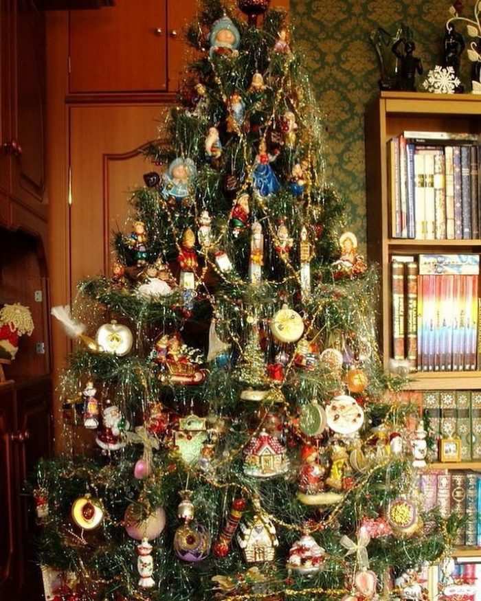 Ретро стилът отдавна се асоциира с топли спомени. Може би всеки в къщата има ценна кутия с играчки от онези времена. Те включват различни фенери и играчки във формата на ангели. Както и играчки с различни форми, изработени от тел и стъклени мъниста. Можете също така да украсите новогодишната си елха с фигурки на Дядо Коледа и Снежанка.