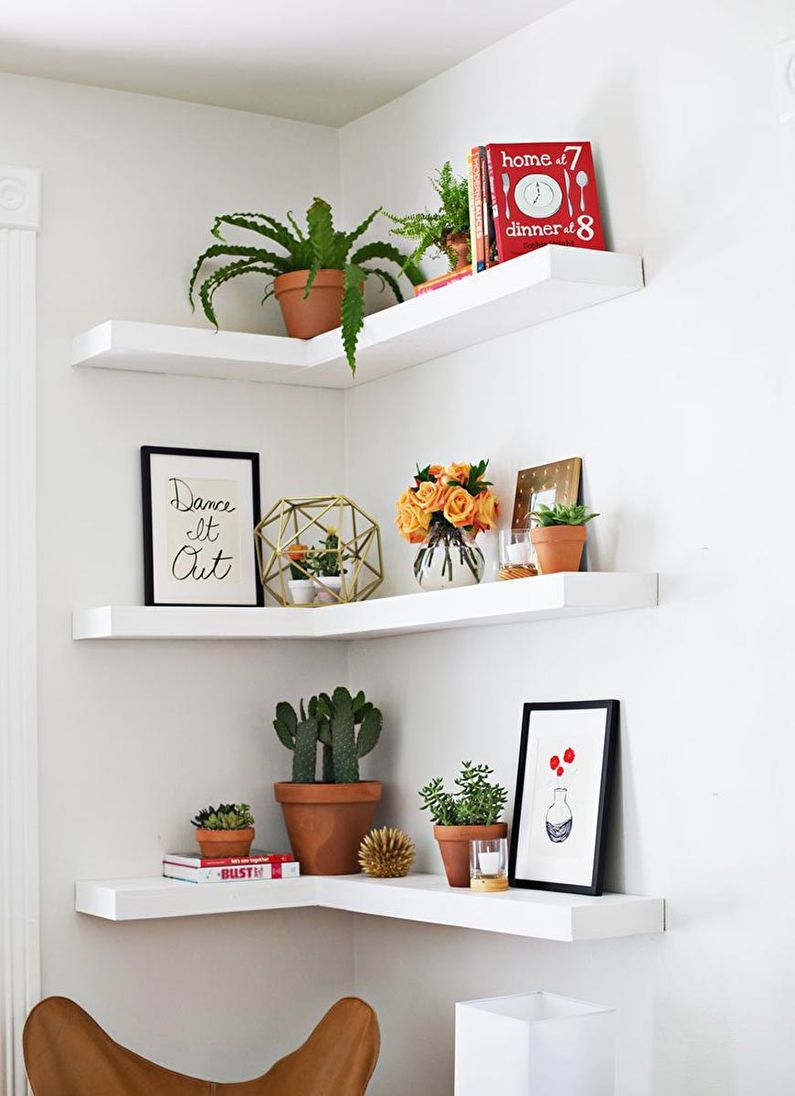 Но не можете просто да окачите рафтове, където има място и както искате. Те трябва да съответстват на стила на интериора, да се съчетават с цветовата гама на стената и да не се губят на фона ѝ.