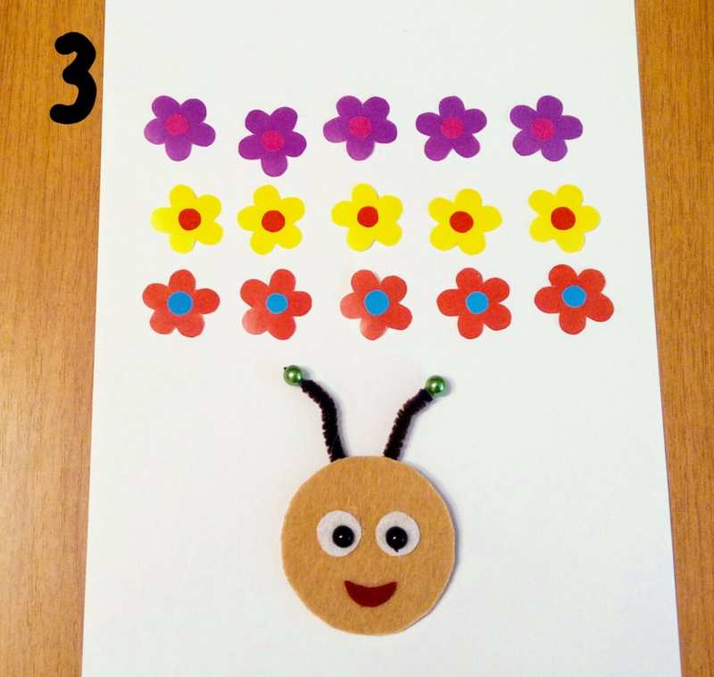 - На лист от същия цвят нарисувайте кръгло лице на гъсеница с рога и го изрежете с ножица.