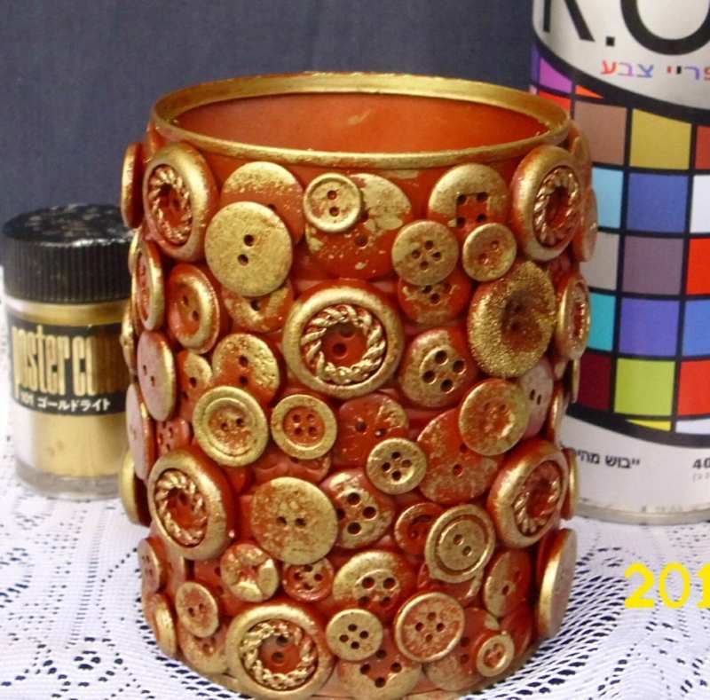 Друг оригинален начин да украсите метален органайзер за кутии е като залепите копчета върху него. За тази цел вземете копчета с различни размери и цветове (или използвайте един тон) и украсете повърхността на контейнера с термозалепващи копчета.
