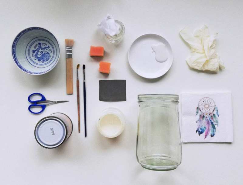 - Изрежете (или откъснете) фрагменти от дизайна от плата и нарисувайте върху буркана с четка и PVA.