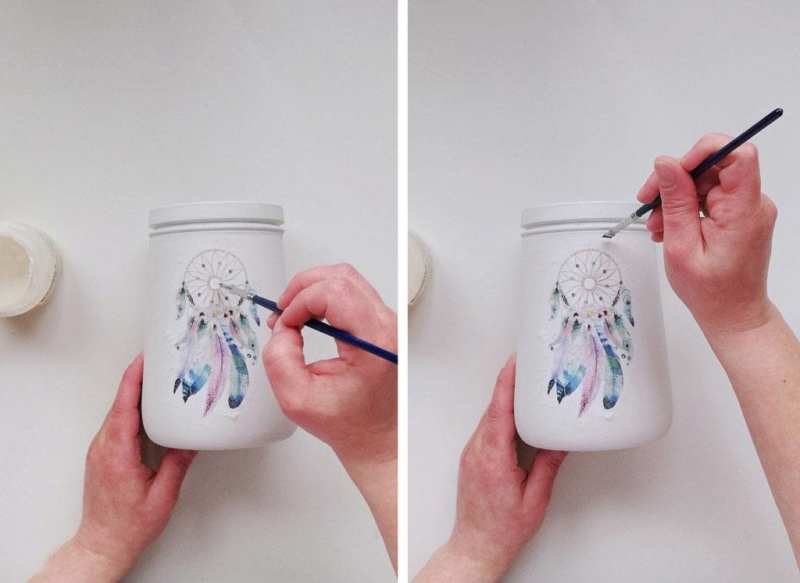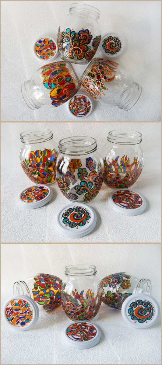 Много красива техника за бродерия е рисуването с витражни цветове. Можете също така да създадете стъклен органайзер в този стил. За основа се използват стъклени контейнери (буркани). Използват се специални бои и четки. Нарисувайте това, което ви харесва.