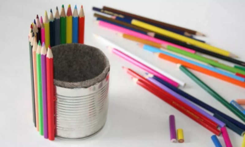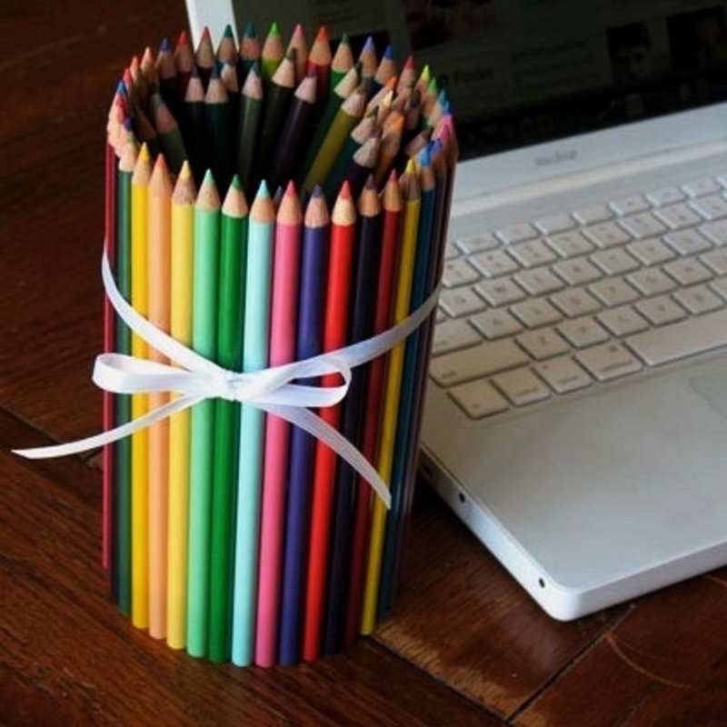Ако кутията със стари, но чисти моливи е затрупана в чекмеджетата, можете да направите цветна поставка за същите моливи, които се използват за работа, както и за химикалки и флумастери.