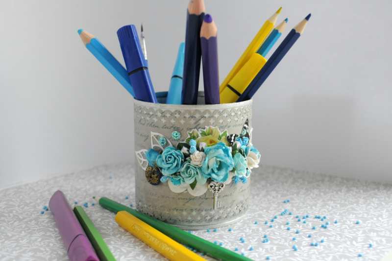 За момичешкото бюро заедно с дъщеря си можете да направите чудесна поставка за пишещи принадлежности, декупаж със салфетки.