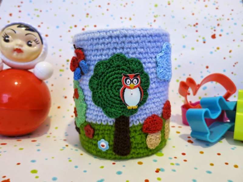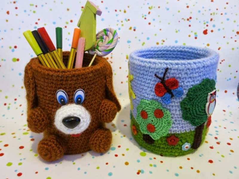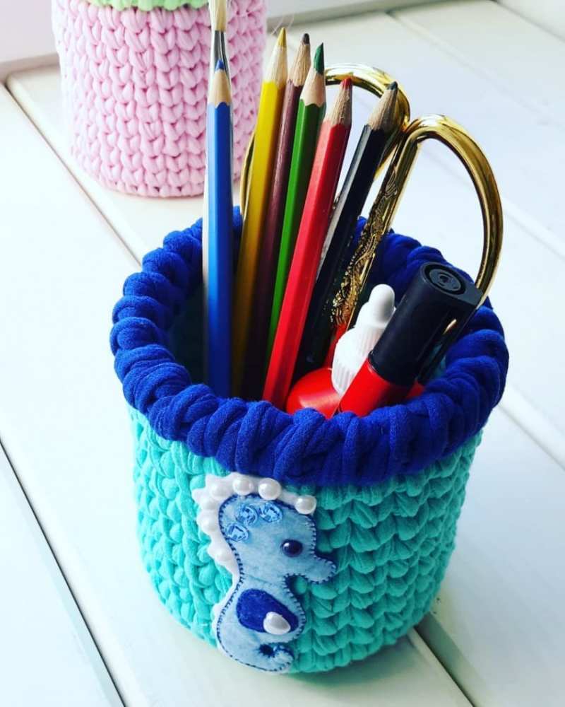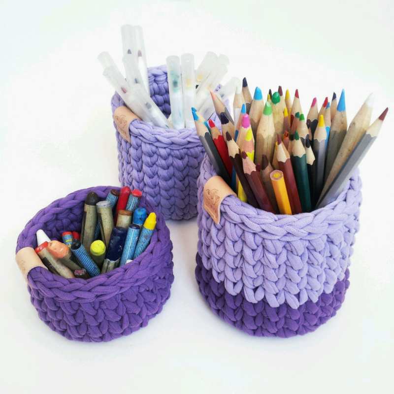 Органайзерите, свързани с плетене на една кука или с игла, изглеждат оригинално и стилно. Изплетете цялата кутия, както и капаци за буркани и кутии. Удобно е да се използват подвижни капаци, които при необходимост винаги могат да се свалят, да се изперат или да се заменят с нови.