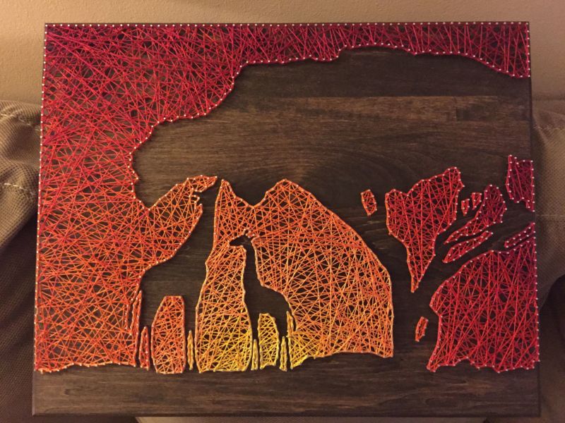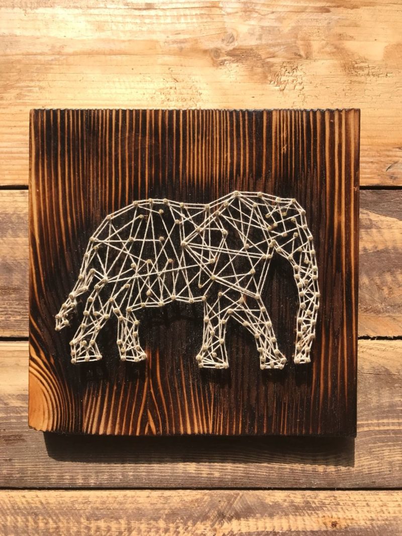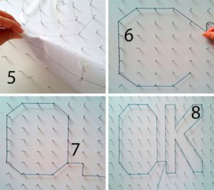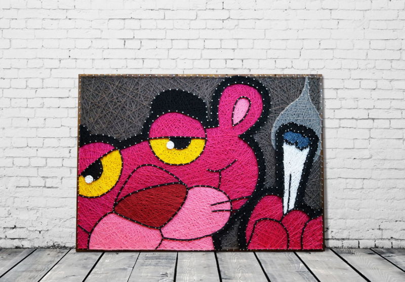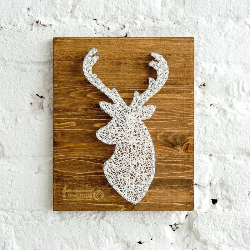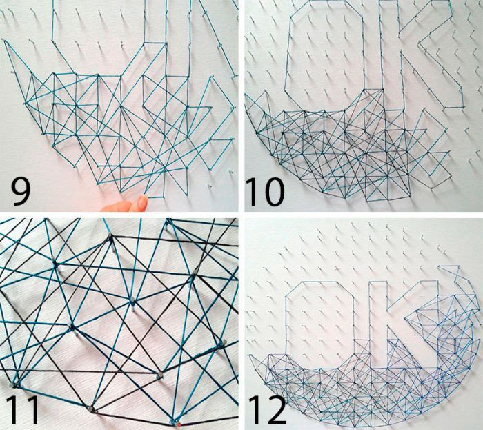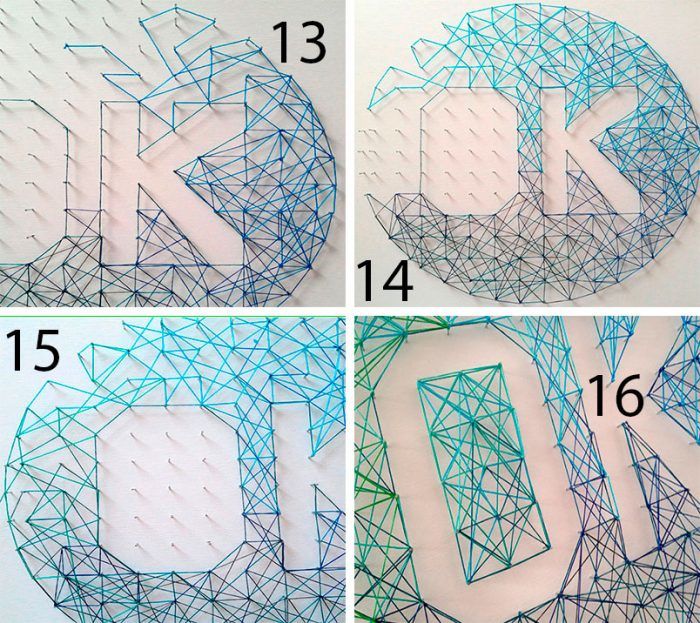 Оригинален начин за "рисуване" с конци е техниката string-art. Това е преплитане на различни цветни контури с влакна, които се забиват върху шперплат или рамка с помощта на малки пирони. Затова е необходимо да се снабдите не само с тънка цветна прежда, но и с чукче със стотина пирона.