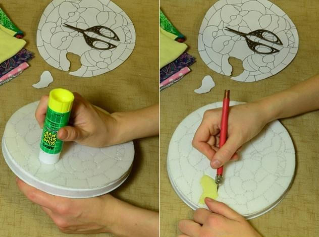 Отпечатване или проследяване на любимите ви изображения. За тези, които имат артистична дарба, можете да започнете със скица на хартия. След това изберете за всеки фрагмент от бъдещото произведение на изкуството клапа с подходящ цвят и продължете с композицията.