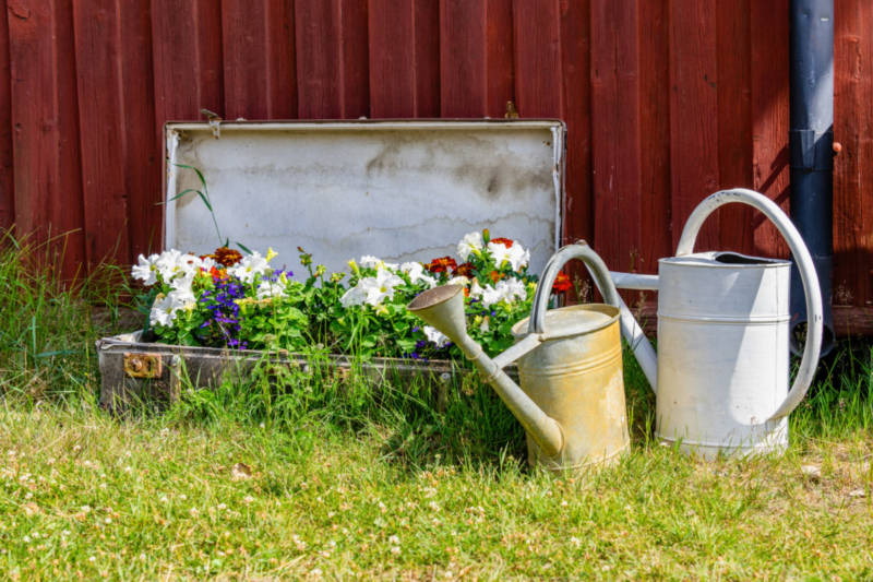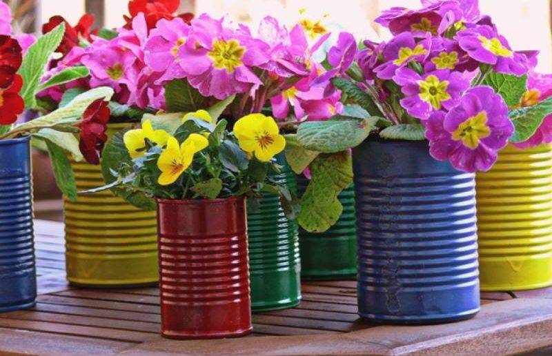 Контейнерите от ламарина или пластмаса за насипни материали и течности могат да се използват и като градински украшения.