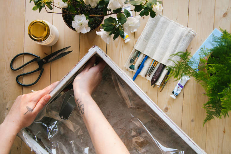 След като сте подготвили куфара си по този начин, подплатете го с непромокаемо фолио, за да издържи по-дълго. Горната част на фолиото може да бъде залепена или прикрепена с телбод към горния край на изделието.