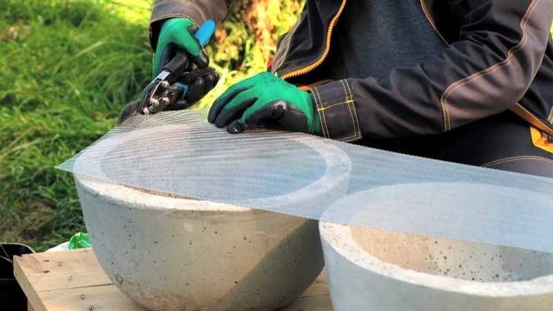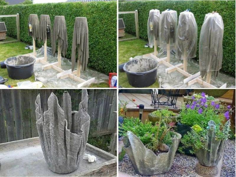За да направите това, разредете не много гъст разтвор на цимент или суха смес в съд и поставете кърпата в него. След това извадете кърпата, напоена с разтвора, и я закачете на обърната кофа или друга избрана форма.
