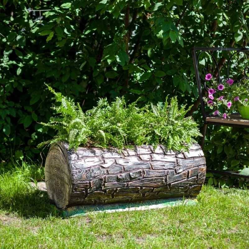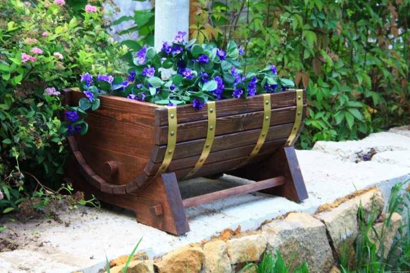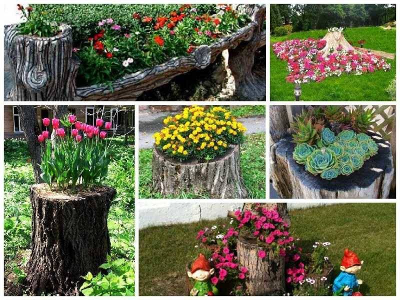 В градината можете да създадете композиция от стари, грундирани и издълбани пънове на дървета и да монтирате вази за цветя с ярки цветни цветя. От парчетата дърво могат да се изработят оригинални контейнери под формата на забавни приказни герои за украса на балкони и тераси.