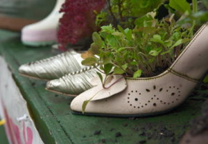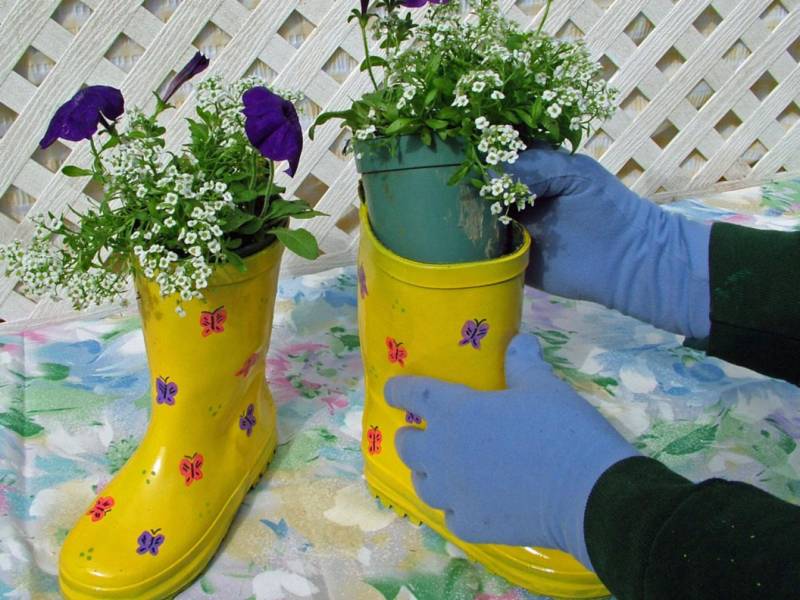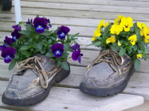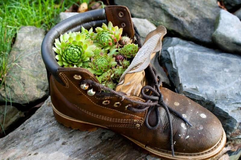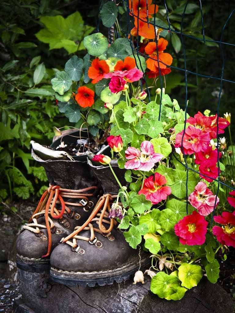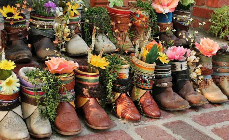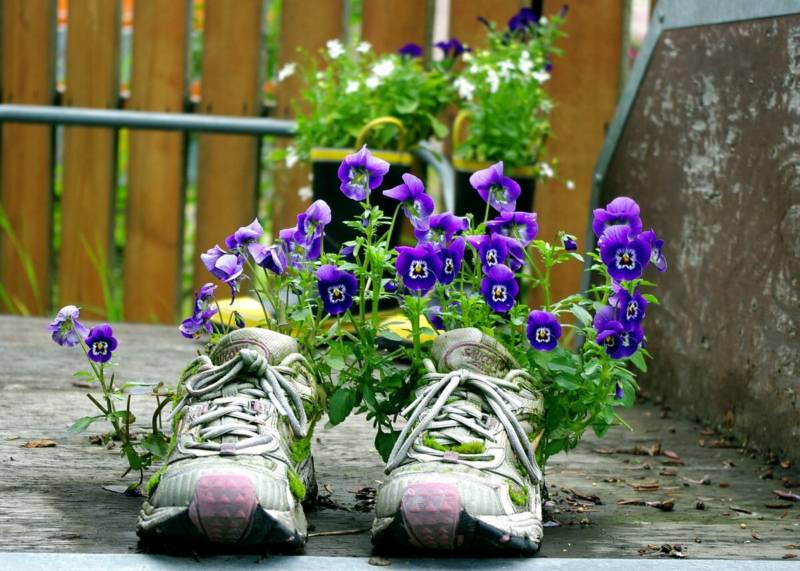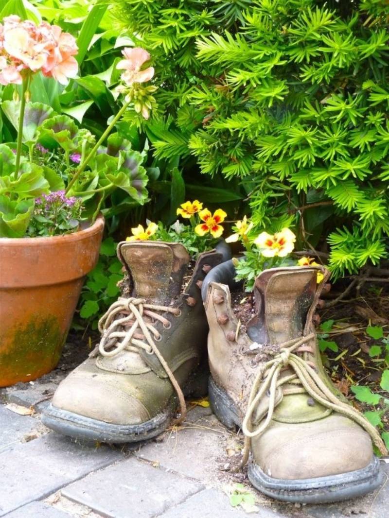 Вкъщи винаги можете да намерите стари чифтове обувки, които са идеални за необичайна цветна композиция в градината или на верандата.