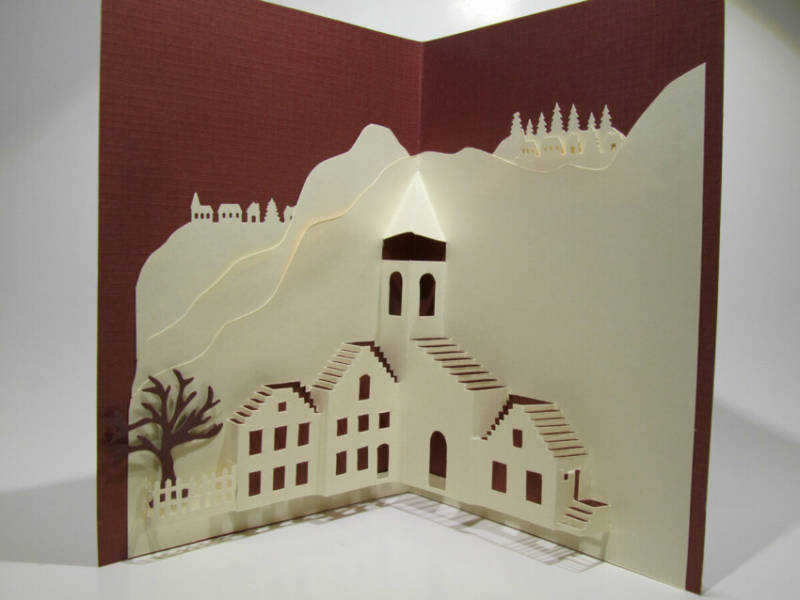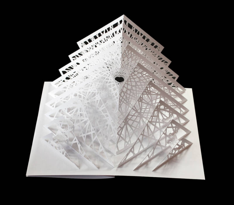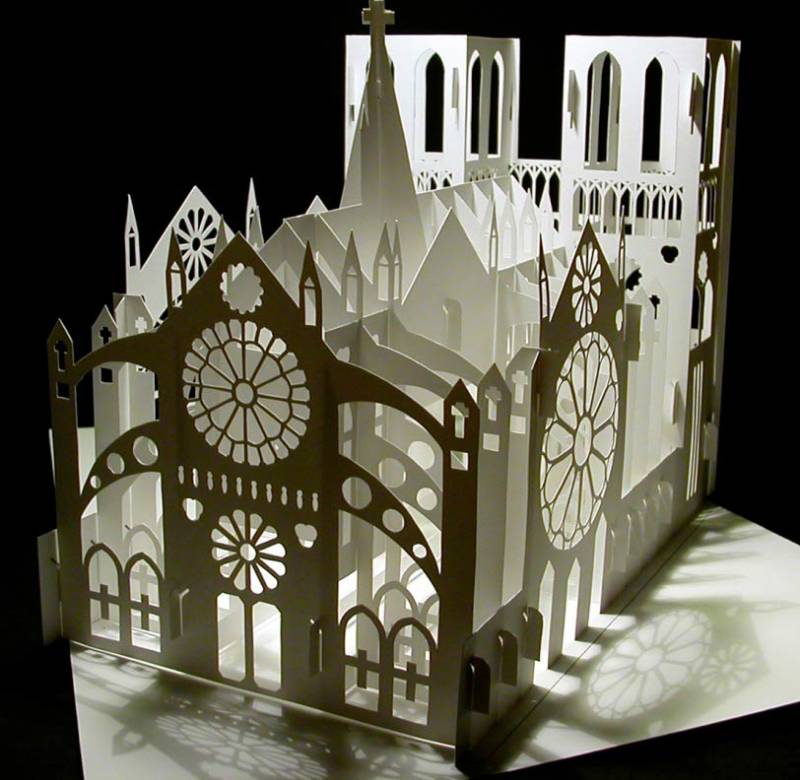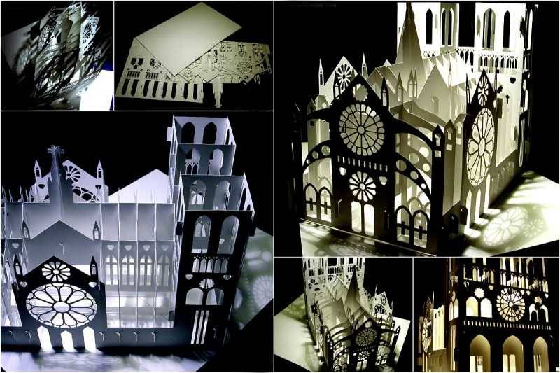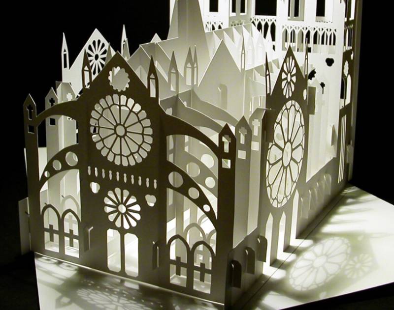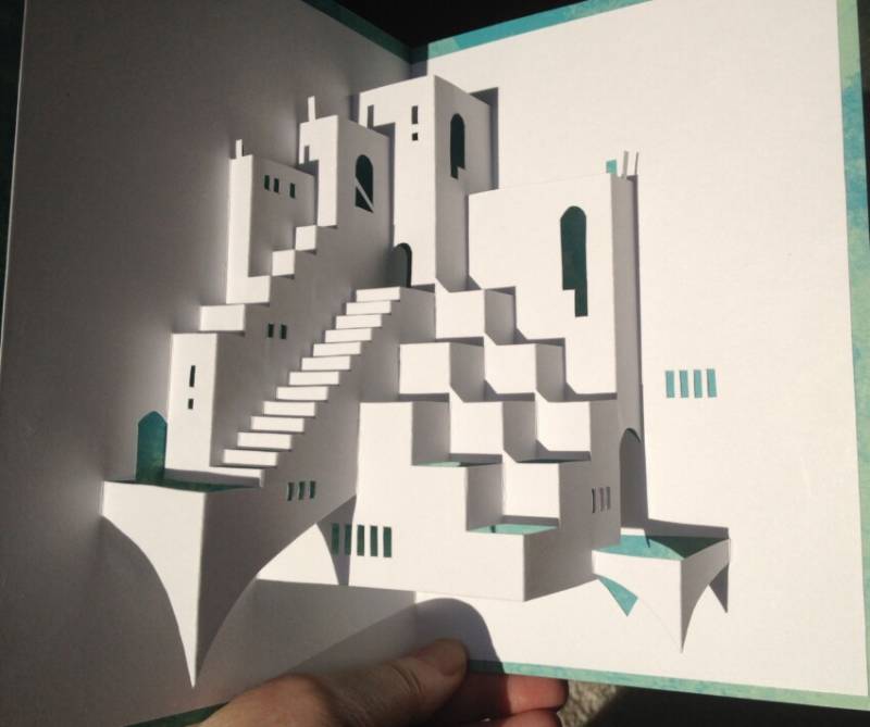 Това е кратка формулировка на техниката киригами. Буквалният превод от японски означава "рязане на хартия". Изрязана и сгъната по определен начин, хартията ще създаде триизмерна картина, сцена или цял архитектурен модел. И всичко това от един лист хартия!