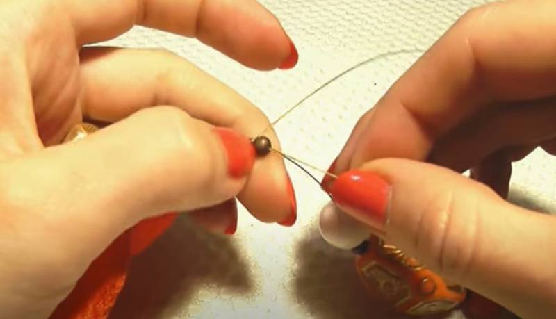 - Първо вземете подготвения конец и го прекарайте през отвора на закопчалката, след което завържете голям възел на върха. Накиснете възела в лепило и го оставете да изсъхне. Добре е лепилото да е бързодействащо - тогава чакането няма да е дълго.