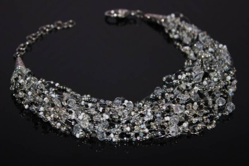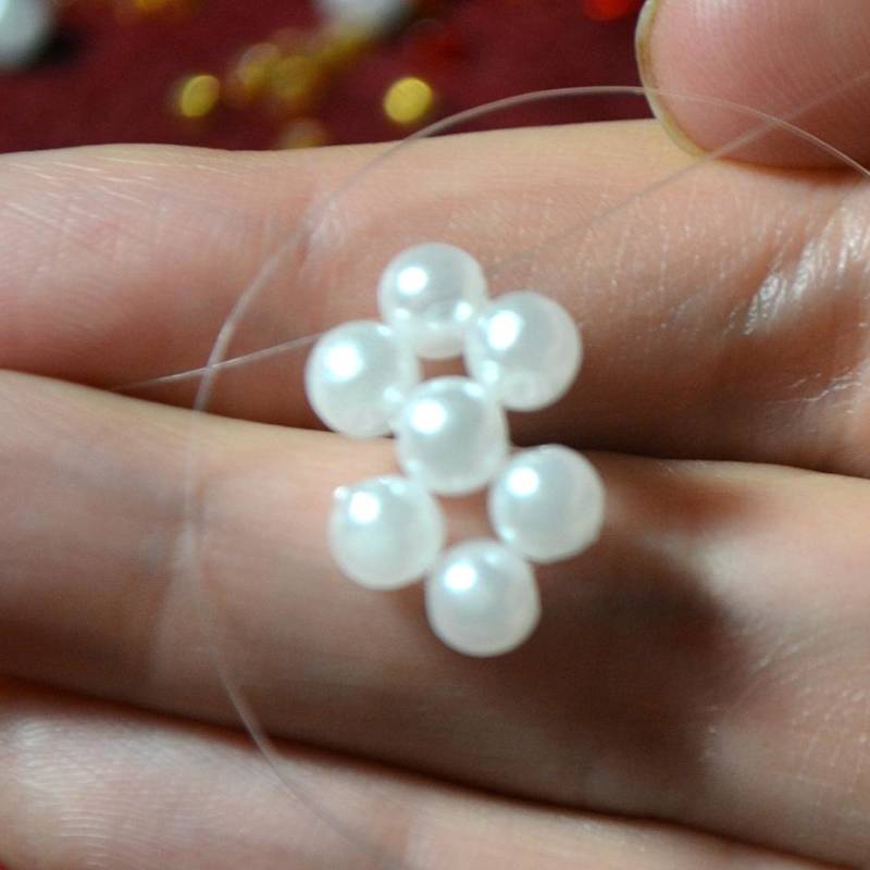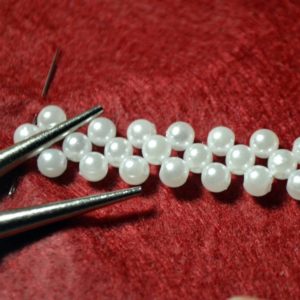 - Затегнете закопчалката с кръгли клещи, така че възелът да влезе в нея. След това нанижете перлите на конеца. Бъдете внимателни, тъй като перлите са деликатни и лесно могат да се надраскат.