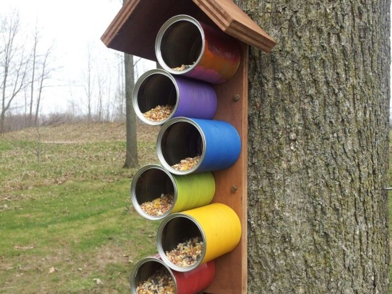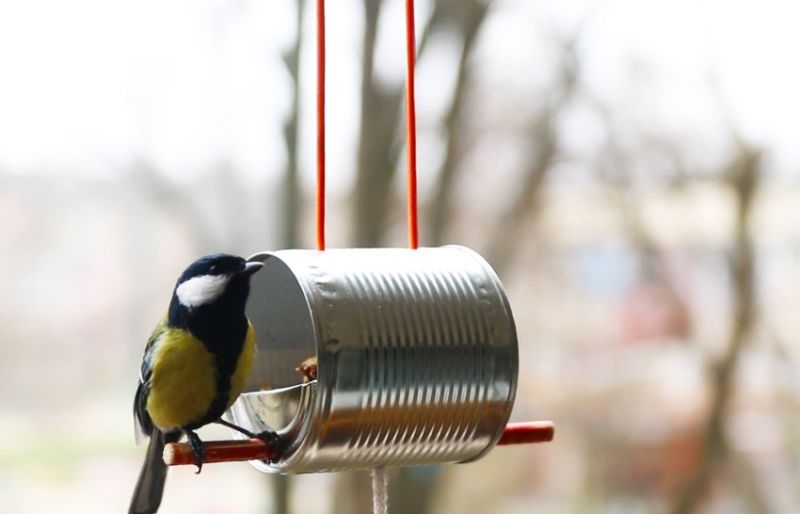 Можете дори да направите оригинална и цветна хранилка за птици от стари консервни кутии: