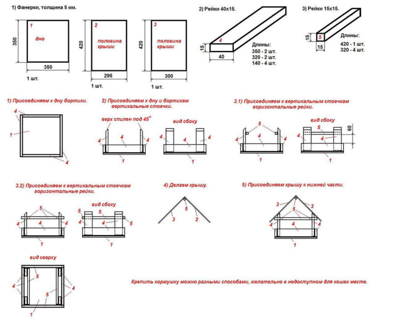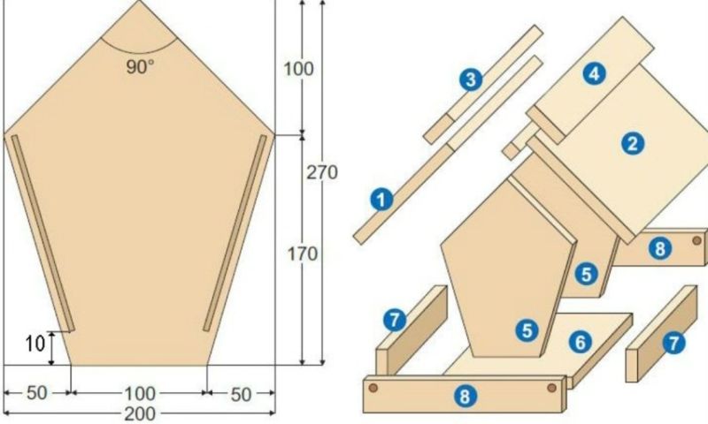 Интересната ясла за птици е изработена от дървени летви, чийто размер и количество също са предварително изчислени.