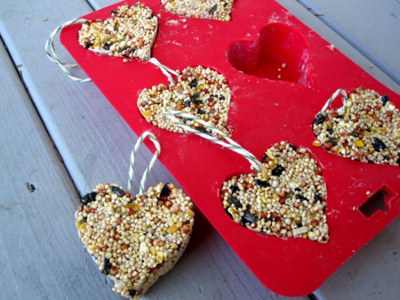 Готовите кубчета или сърца (в зависимост от използваната форма) се прикрепят към метална примка и се окачват на клон.