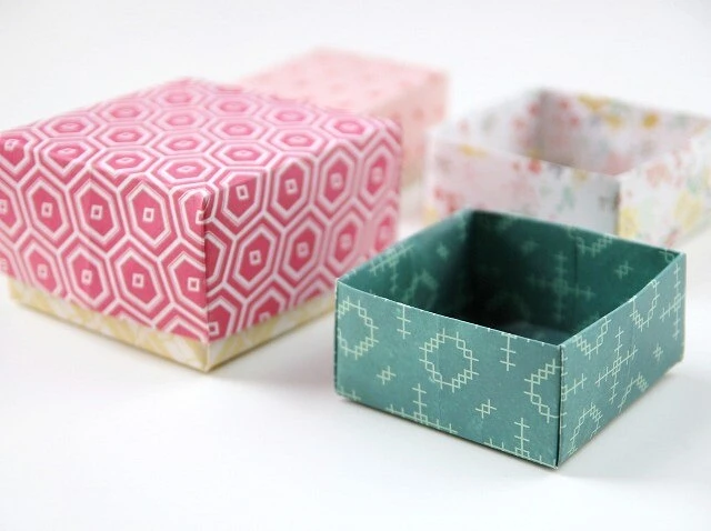 Кутиите за оригами се изработват с капак, както е описано по-горе. Само капакът трябва да е малко по-голям, за да може да покрие опаковката.