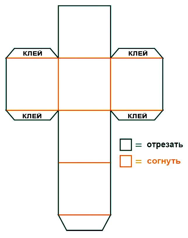 - Ако няма диаграма, чертежът трябва да бъде нарисуван. За целта начертайте с линийка четири квадрата със страна 10 см. Вторият квадрат вдясно (ако погледнете модела право напред) има още един квадрат отгоре и отдолу с трапецовидни ръбове, които ще бъдат огънати и залепени навътре, за да се сглоби продуктът в процеса на работа.