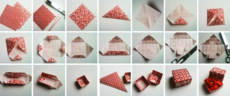 Самата кутия за оригами няма да се разпадне без лепило, но за допълнителна защита можете да залепите триъгълници вътре или да поставите подложка от картон на дъното. Ако желаете, такава кутия може да бъде покрита по подобен начин, но малко по-голяма.