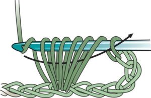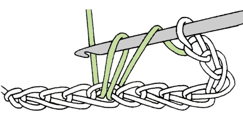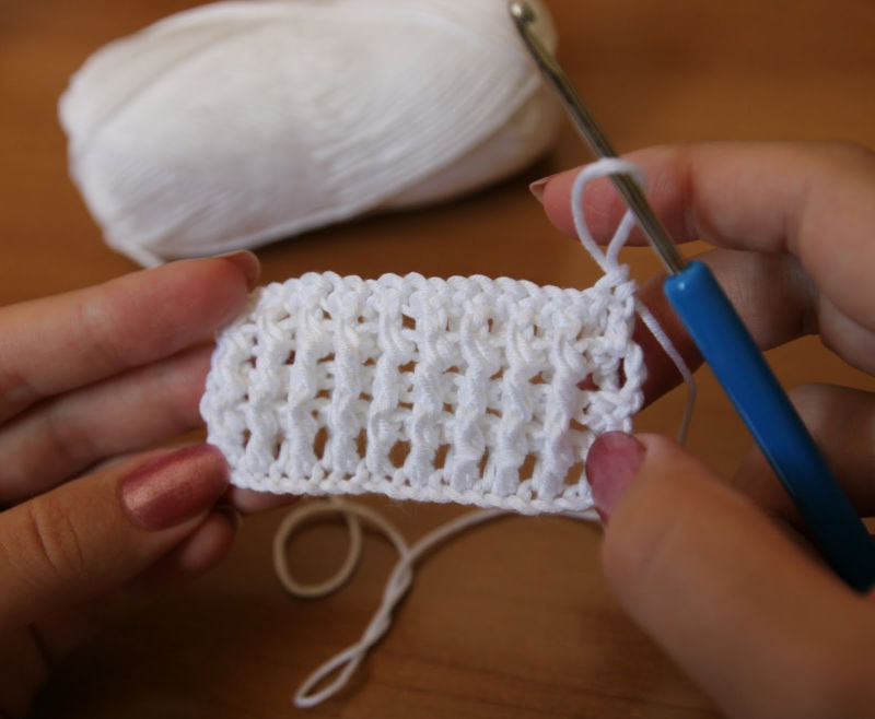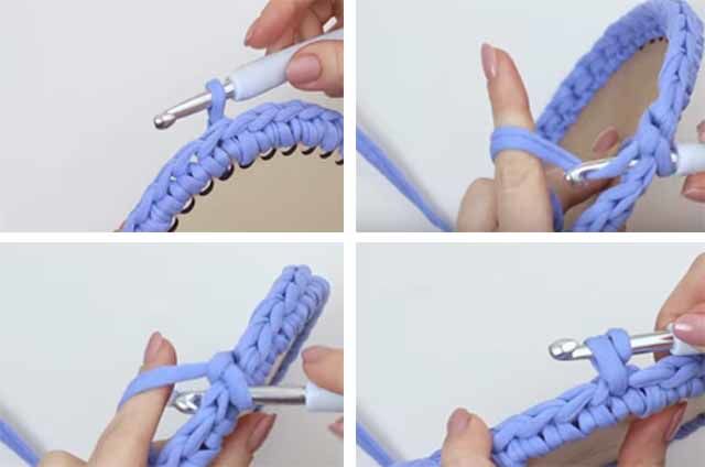 При изработването на продукта поставете куката за плетене на една кука във всяка дупка последователно, като използвате шевове. Ако куката е трудна за изтегляне на колоните, просто прекарайте конеца през дупката, образувайки въздушна примка.