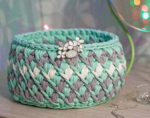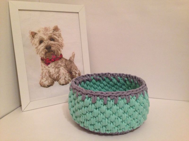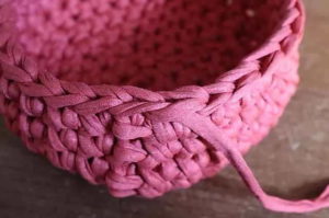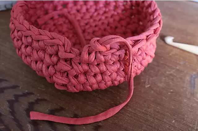 В последния ред е възможно да направите бордюр, като направите съединителни бримки. След това работната нишка се отрязва, закрепва се краят, изважда се отвътре. Кошницата от трикотажни платове е завършена, ако не са предвидени допълнителни елементи.