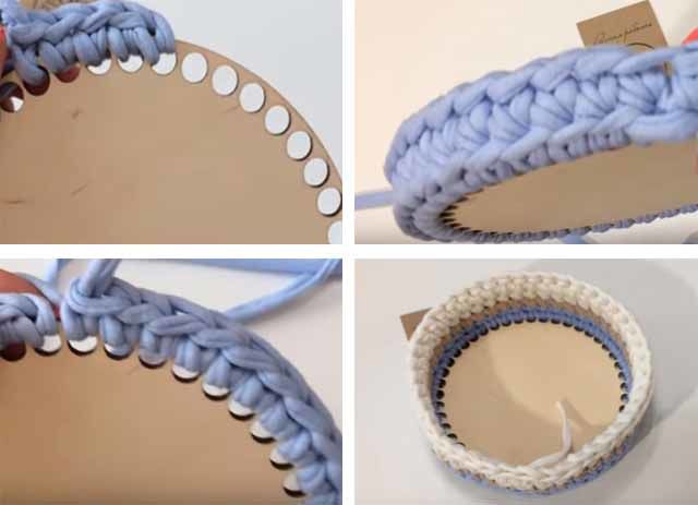 По този начин се получава верига по периметъра на готовата форма. След това се плетат стените по обичайния начин.