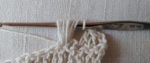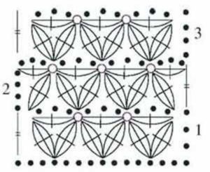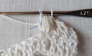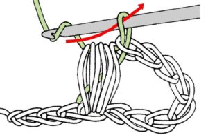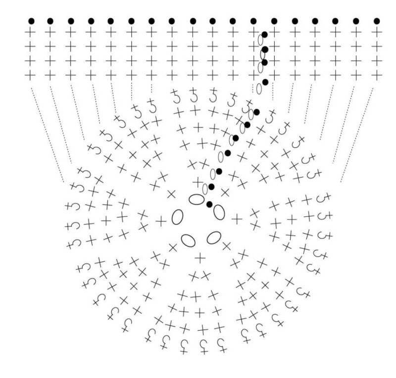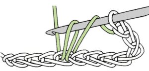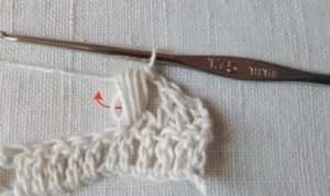 За всяка част не поставяме куката под бримките на предишния ред, а в центъра на бримката. По този начин куката е разделена наполовина от окото на предишния ред.