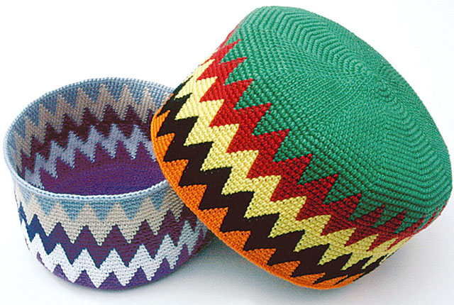 Жакардовите кошници на една кука обикновено се изработват с гладка плетка. Акцентът на продукта е моделът, образуван от променящите се цветове. Тези кошници са лесни, но забавни за плетене.