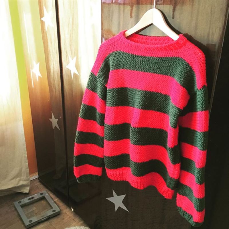 Основата на костюма, както винаги, е несложна: широкопола жилетка, за предпочитане в червено и зелено (но всяка друга жилетка на райета е подходяща), и черен класически панталон. Заложете на кафява шапка, плашещ грим и ръкавица с остриета.