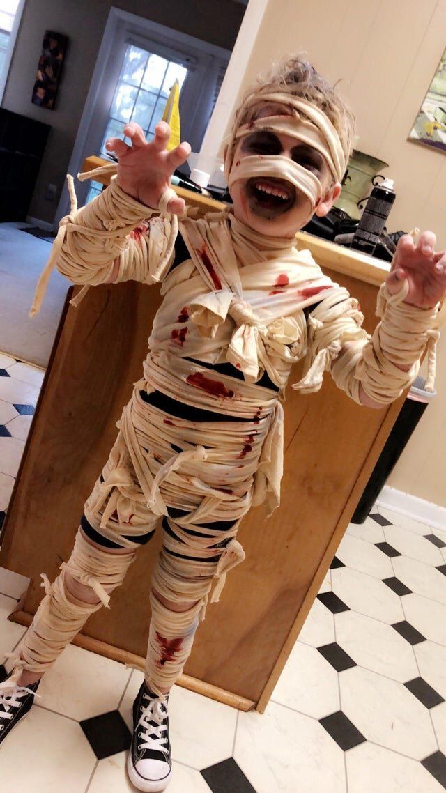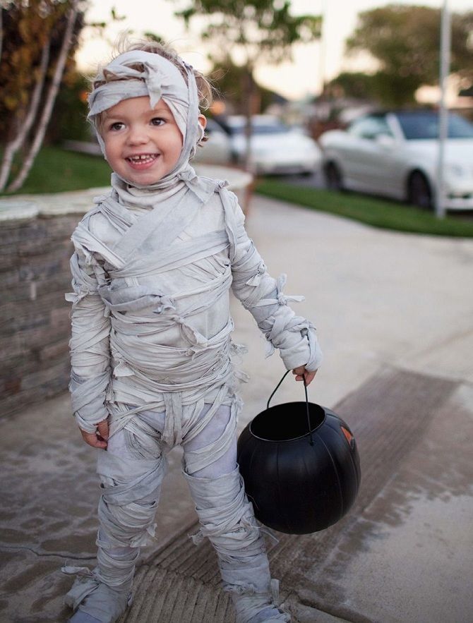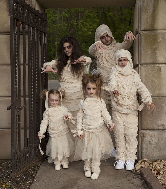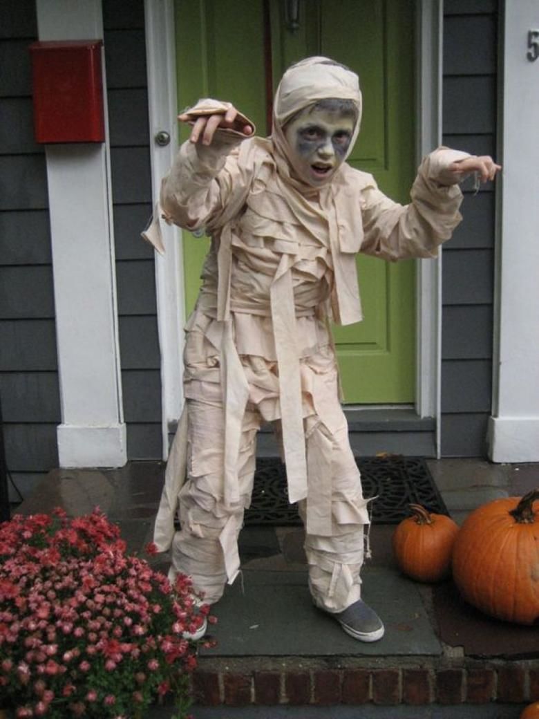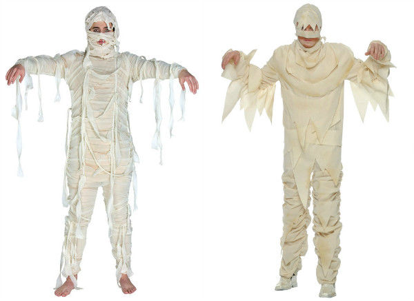 За костюма на мумията са ви нужни плътно прилепнали дрехи, за предпочитане сиви или бели, които могат да се изхвърлят след партито, бинтове или стари чаршафи, чай, ножица и игла и конец.