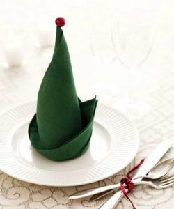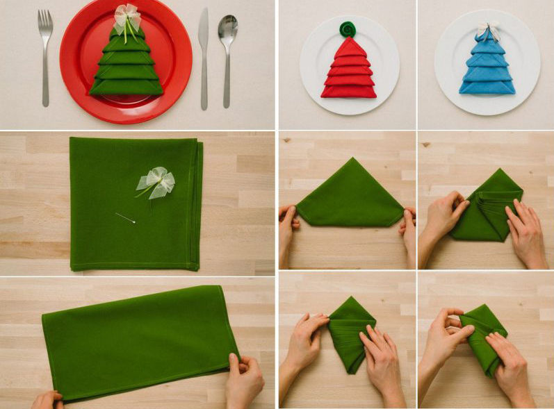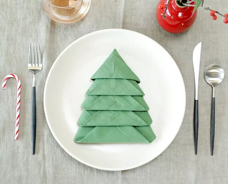 Интересен елемент от празничната новогодишна трапеза са хартиените салфетки, навити във формата на коледна елха. Можете да играете с цветовете.