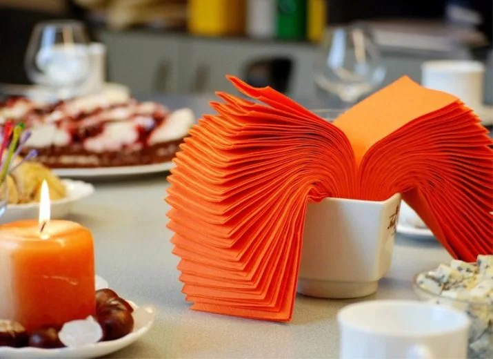 В обичайните поставки за салфетки, които трябва да има на всяка маса, хартиените салфетки обикновено са подредени в ъглите. Това е най-простият и лесен метод.